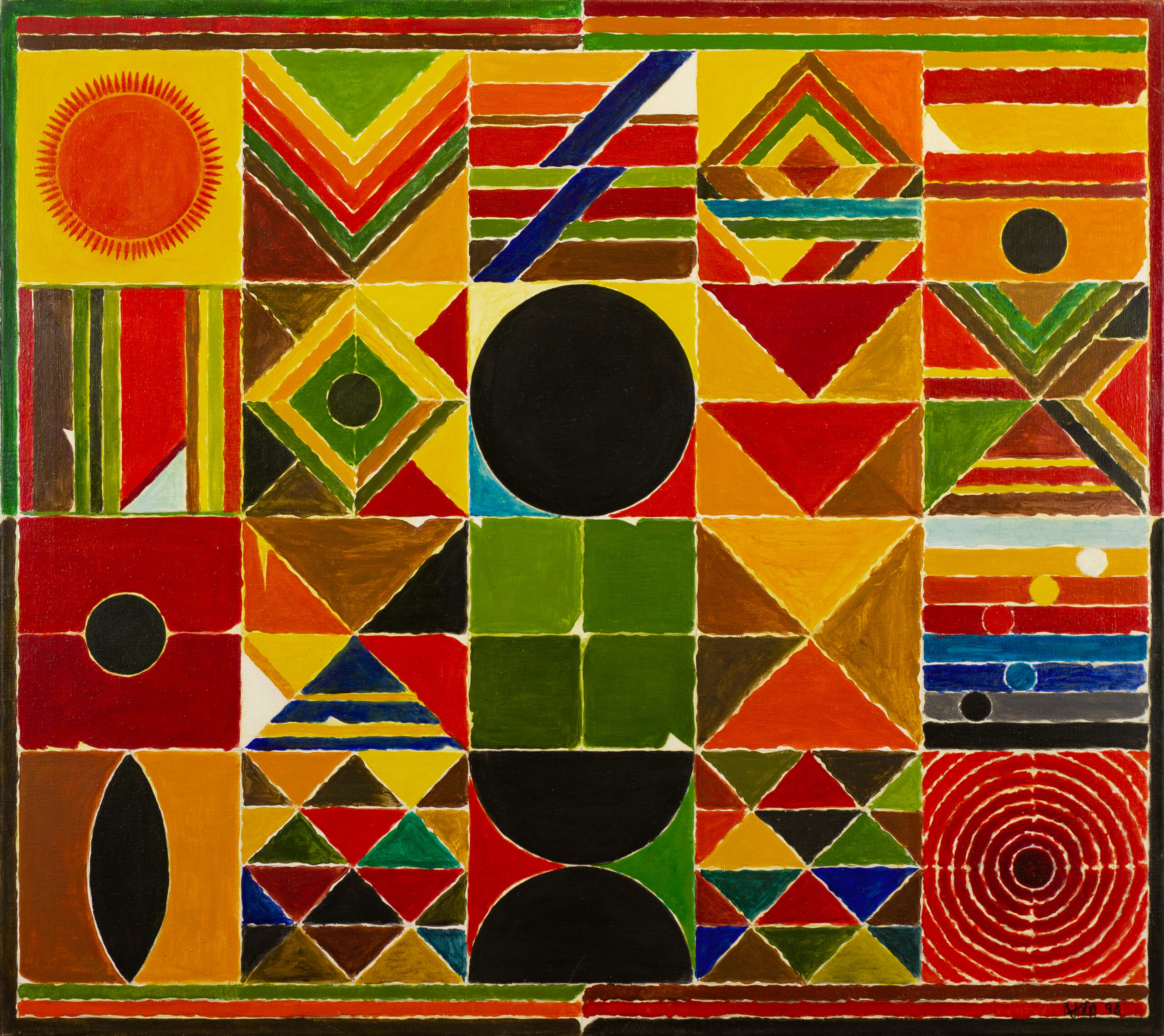 This painting by Sayed Haider Raza features a bold geometric composition in vivid, earthy colors, drawing from traditional Indian symbols and vibrant modernist forms. The artwork is divided into a grid of rectangular segments, each showcasing unique patterns, colors, and shapes, including triangles, circles, and squares. Central to the composition are contrasting blocks of black and green, creating a sense of balance and focus within the mosaic-like structure.